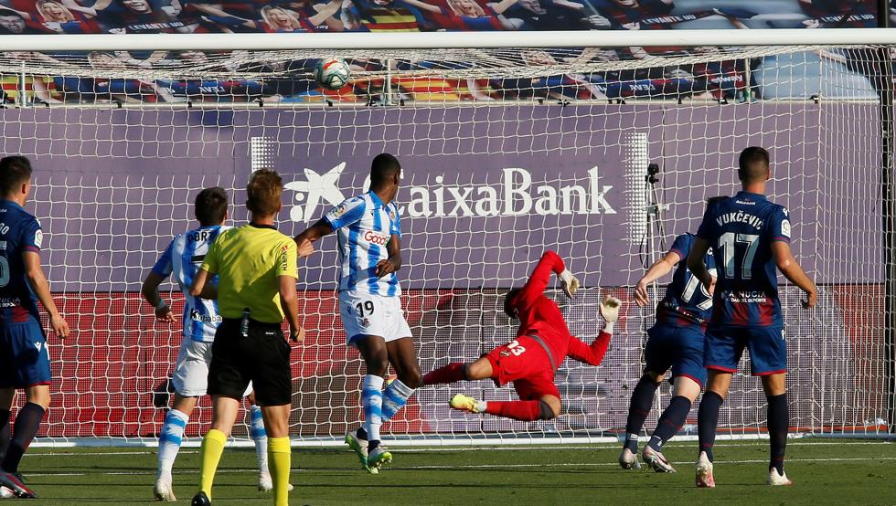El cuadro realista trató de llevar el peso del juego ante un Levante agazapado, con el cuchillo entre los dienes y el pase largo a la carrera de sus laterales siempre listo. Tras el tanteo inicial, los de Imanol golpearon primero. Fue en un arranque de genialidad, una maravilla en forma de espuela de un Isak que parece haber recuperado la inspiración.