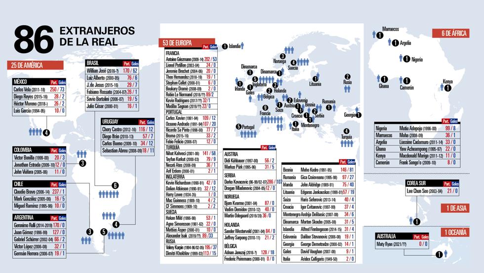 Ya había foráneos en aquella Real iniciática de 1909, pero fue con la llegada de Aldridge en 1989 cuando se retomó la necesidad de reforzarse con futbolistas de otros lugares. En estos 32 años, han existido más fiascos que aciertos, aunque la tendencia ha cambiado nítidamente en los últimos tiempos, con futbolistas de la talla de Alexander