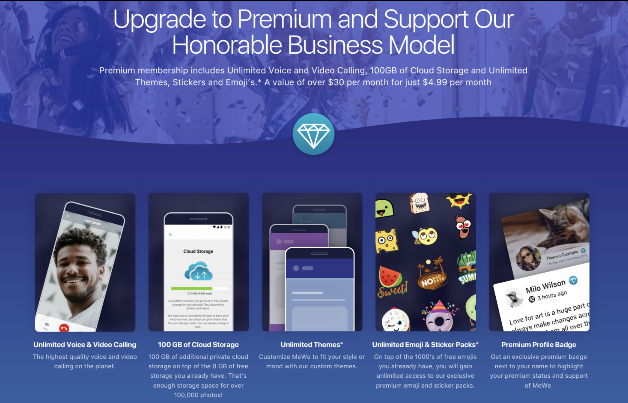 El nivel premium de MeWe costará $ 4.99 por mes y el servicio profesional de la compañía tiene un enfoque de dos niveles, con un precio de $ 3.99 y $ 7.99.