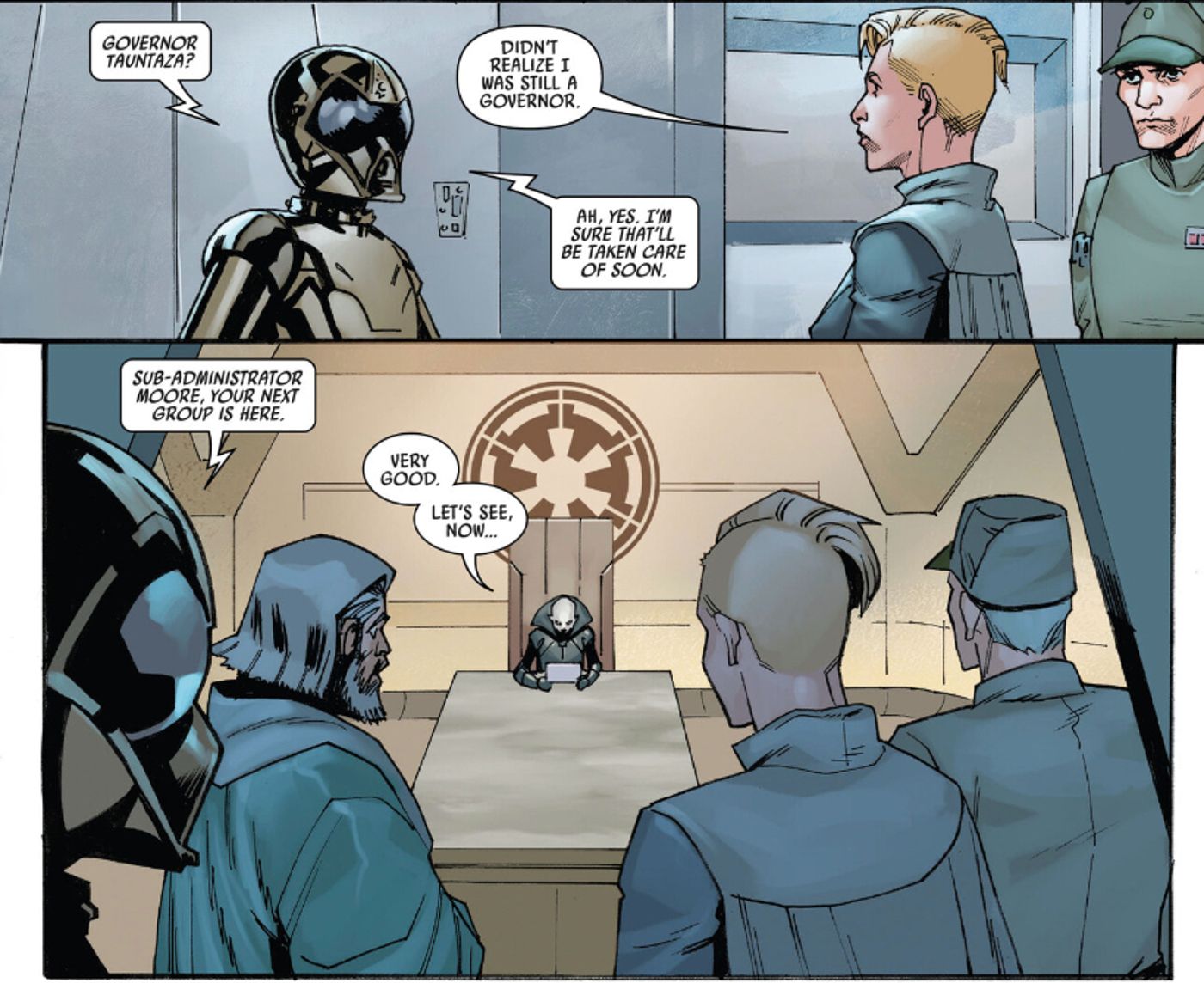 Darth Vader #43 – escrito por Grek Pak, con arte de Adam Gorham, color de Federico Blee y letras de Joe Caramagna – describe el reclutamiento del deshonrado Gobernador Tauntaza, y varios otros chivos expiatorios imperiales, en la conspiración del Cisma Imperial, por parte del subadministrador. Astuto Moore.