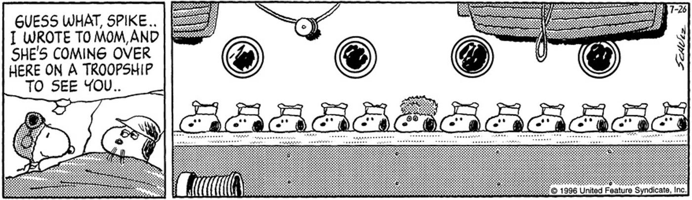En otro, Snoopy visita a su hermano Spike postrado en cama. Snoopy le dice a Spike que le escribió a su madre y que ella vendrá en un barco de tropas para verlo.
