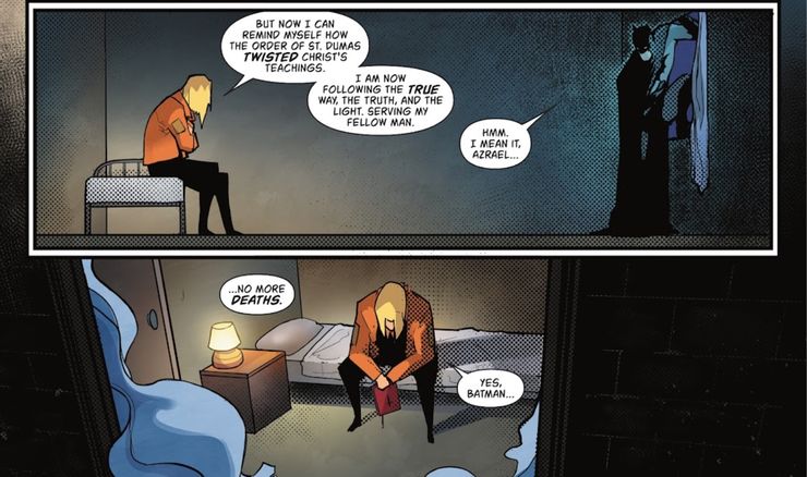 Jason Todd ha matado antes y Bruce definitivamente lo ha reprendido por ello. Pero en estas apariciones recientes, Caperucita Roja cruzó la línea y mató con Batman esencialmente dejándolo libre de culpa. Los lectores pueden argumentar que esto se debe simplemente a la tensa relación padre / hijo que tiene con Jason, pero eso no explica por qué permite que Azrael cruce la misma línea. Jean-Paul puede ser miembro de la Bat-Family, pero en la continuidad actual, es una afiliación tensa y suelta en el mejor de los casos. No hay razón para que Bruce deje ir a Valley con poco más que una conversación severa si realmente cree que Azrael ha estado dejando atrás un recuento de muertos. Aunque Valley es inocente, la naturaleza poco confiada de Batman lo ha vencido más de una vez, por lo que es una sorpresa que simplemente esté tomando la palabra de Azrael incluso si realmente es inocente.