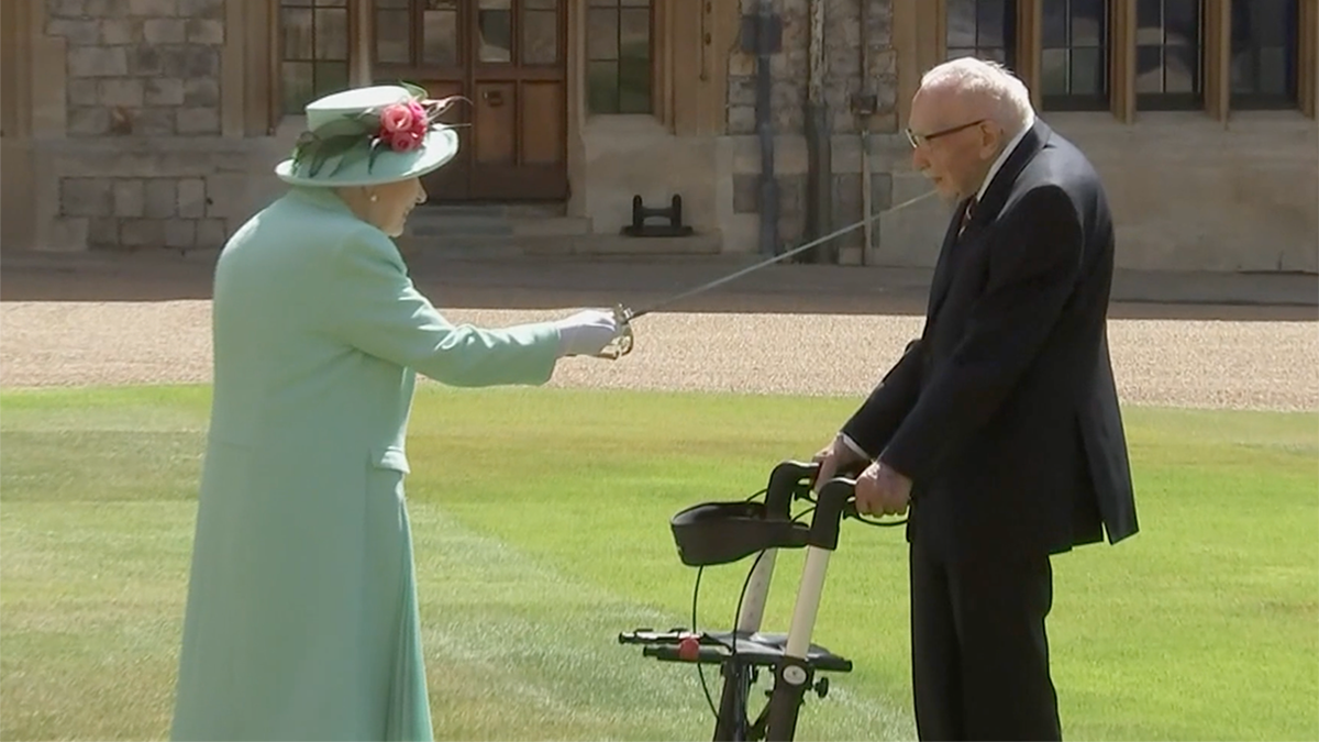 Moore cautivó al público británico cuando se retó en dar 100 vueltas en el jardín de su casa en Inglaterra este abril, recaudando unas 33 millones de libras esterlinas ($40 millones) para el Servicio Nacional de Salud. La reina lo nombró caballero con el tradicional golpe de espada, pero no se requirió que el veterano se arrodillara ante la monarca.
