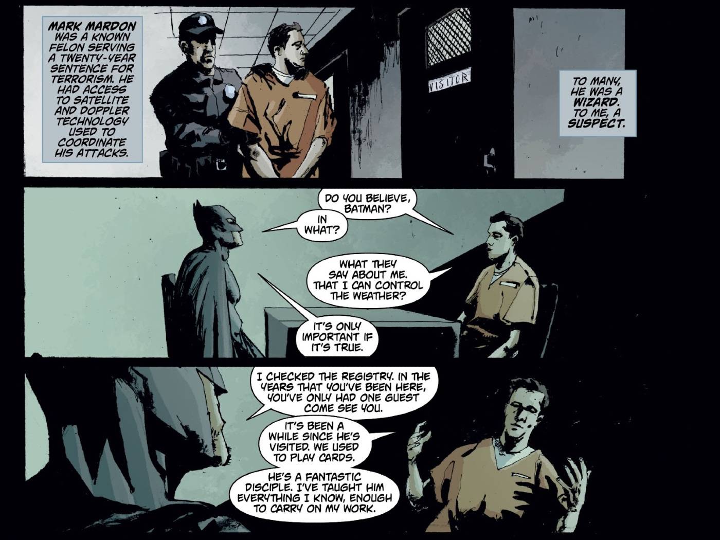 Batman: Arkham City – Fin del juego El número 1 de Derek Fridolfs, Jason Shawn Alexander, Lee Loughridge y Travis Lanham presenta a Batman a Mark Mardon, conocido por los fanáticos como Weather Wizard. Mientras Bruce lucha contra el plan post-mortem final del Joker, recuerda la vez que interrogó a Mardon en Blackgate. Tras cumplir veinte años de condena por terrorismo utilizando satélites y tecnología Doppler, Mardon sólo tuvo un visitante a lo largo de los años: el Joker.