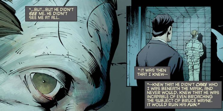 Al final del arco en hombre murciélago # 17, Bruce le dice a Alfred que al principio de su carrera como Batman, visitó Arkham Asylum con el pretexto de la filantropía, donde confirmó directamente su identidad como Batman a Joker. Para su sorpresa, Joker miró impasible tanto a Bruce como a la tarjeta que sostenía contra el cristal de la celda. Bruce dice: “Fue entonces cuando supe, supe que a él no le importaba quién era yo debajo de la máscara, y nunca lo haría. Sabía que era incapaz de siquiera abordar el tema de Bruce Wayne. Arruinaría su diversión.“
