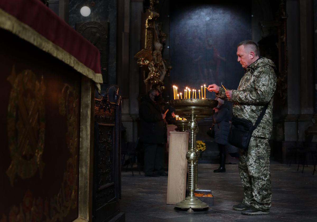 Varias personas rezan en la iglesia de los Santos Apóstoles Pedro y Pablo, en Lviv, Ucrania. Jaime Villanueva