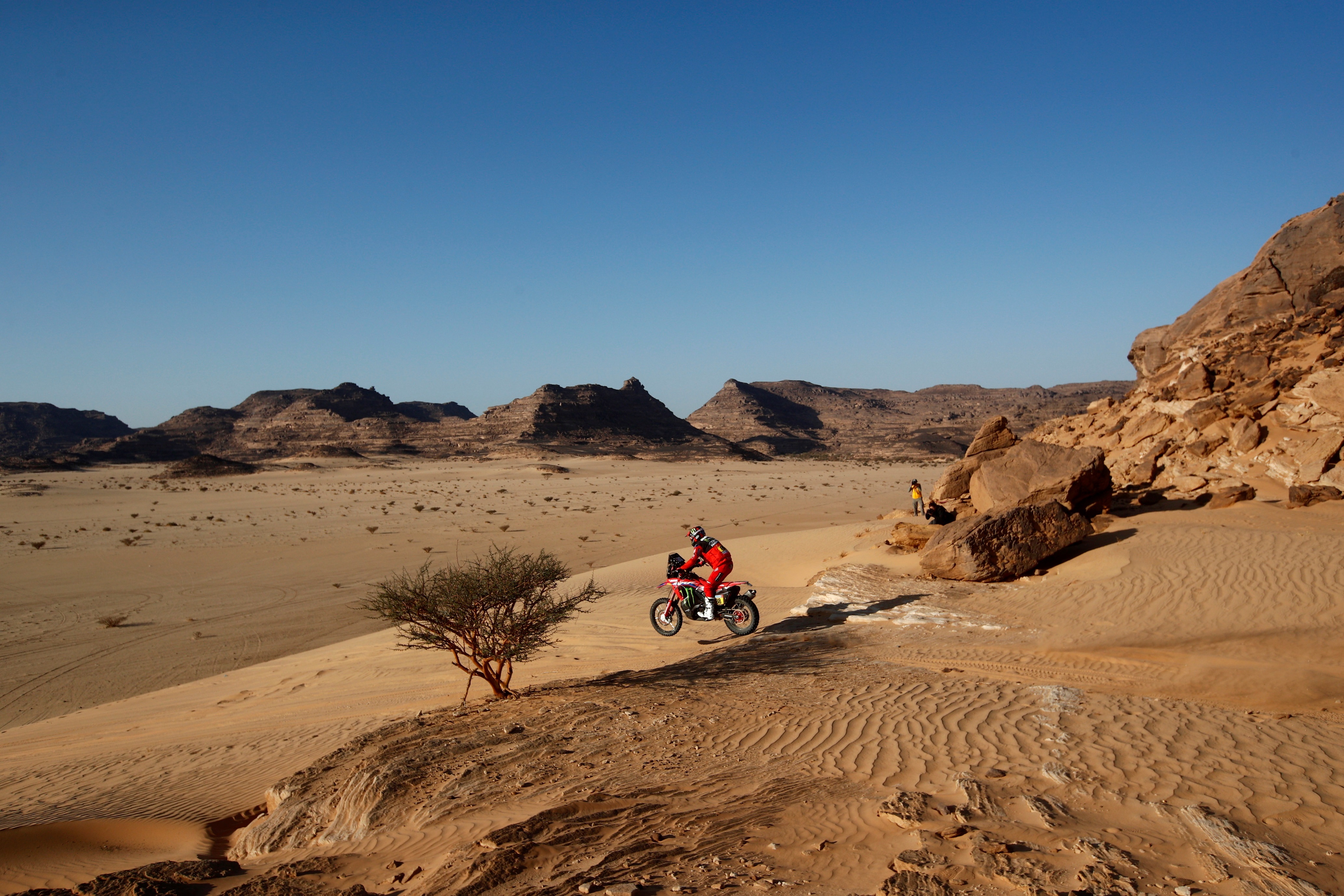 Además, el ganador de la pasada edición, Kevin Benavides (Honda) se vio obligado a abandonar tras una rotura de motor. De modo que la etapa, 375 kilómetros camino de Bisha, muy rápida, de las que más, con muchos cruces y pistas, que podría haber sido un regalo para el de Torreblanca, que habría dado un buen salto en la general, vio cómo un error de cálculo y un exceso de velocidad del que probablemente era consciente, le ponían las cosas algo más difíciles de cara a las dos etapas finales.