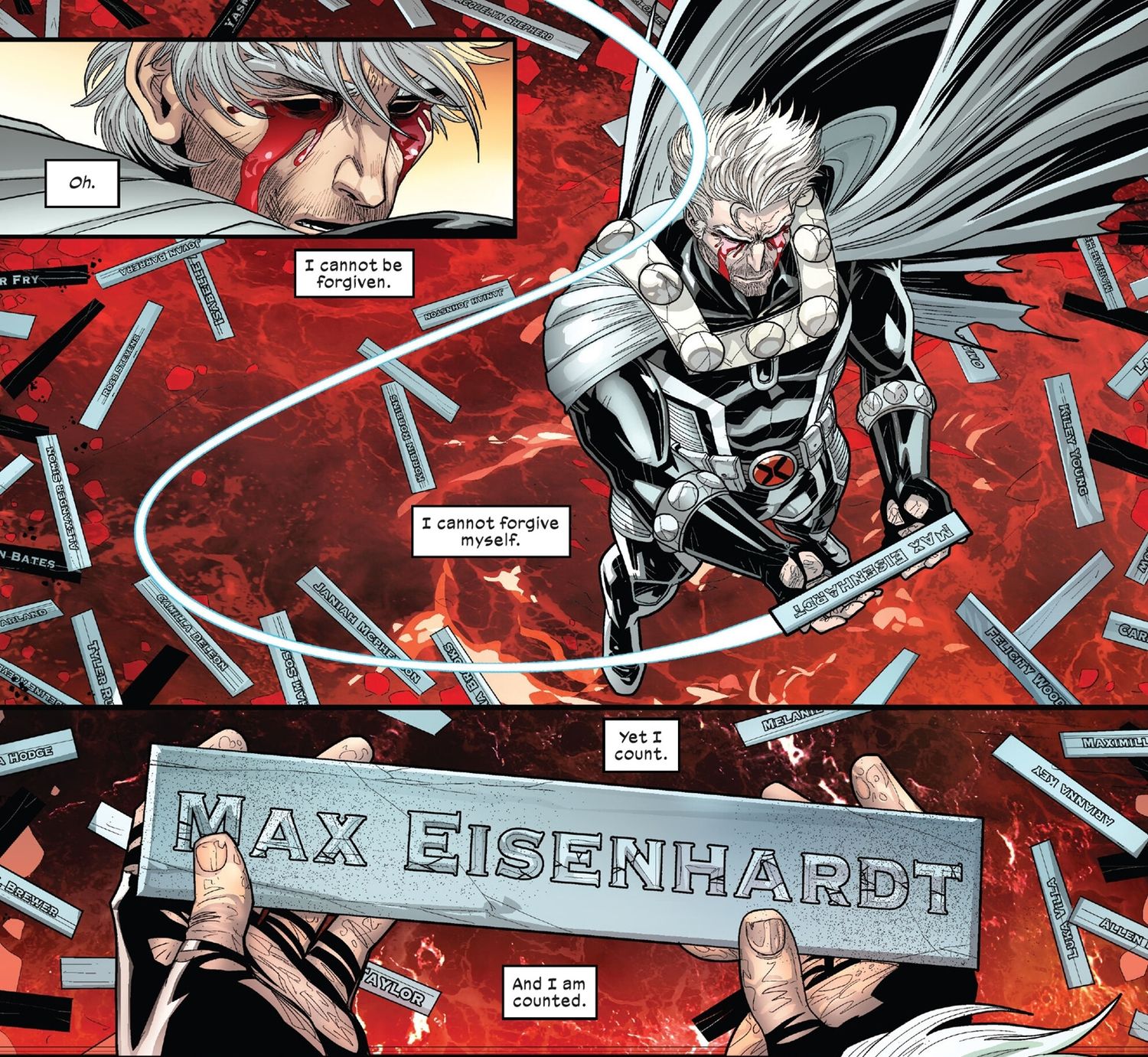 Aunque Storm finalmente logra convencer a Max de que lo necesitan nuevamente y demuestra que ha salvado vidas sin contar, nadie puede aliviar completamente el peso de su culpa. Magneto está dispuesto a dejar atrás la muerte y volver al mundo para luchar contra Orchis, pero no lo hará solo. Su arrepentimiento y dolor estarán ahí con él. Por mucho que cambie, nunca se lo perdonará a sí mismo, e incluso incluye su propio nombre en su muro de arrepentimiento. Magneto Ha sido un superviviente, un villano y un héroe, y su culpa los conecta a todos.