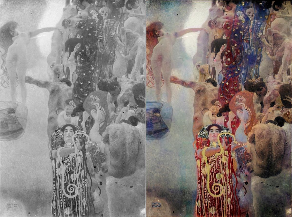 La última pista que existe de Medicina, Jurisprudencia y Filosofía, las denominadas Pinturas de la Facultad, de Gustav Klimt, es de 1945. Las tres grandes obras estaban en un castillo en Austria que, el día antes de que acabara la Segunda Guerra Mundial, los nazis mandaron quemar antes de que el Ejército Rojo les confiscara un patrimonio artístico que ellos mismos habían expoliado por toda Europa. En aquel incendio desaparecieron más obras del artista austriaco, no se sabe cuántas, lo que parece más que probado es que estas tres piezas de finales del siglo XIX, de más de cuatro metros, sucumbieron a las llamas. El único rastro que quedaba eran unas fotografías en blanco y negro hasta que recientemente el Google Arts & Culture y el Museo Belvedere de Austria han resucitado las piezas y sus brillantes colores gracias a la inteligencia artificial.