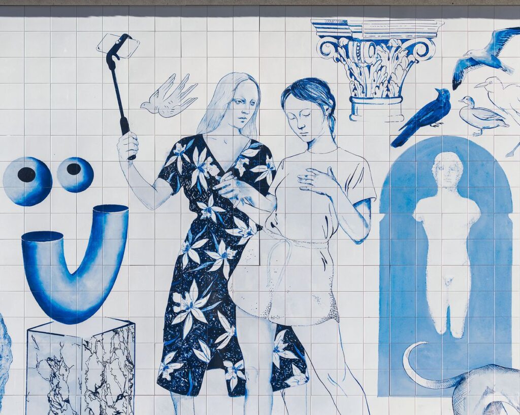 Los Bravú. En plena Gran Vía madrileña, en la fachada del Palacio de la Música, el dúo de artistas formado por Dea Gómez y Diego Omil expande un dibujo bajo técnicas que van desde la acuarela hasta el rotulador al soporte del azulejo.