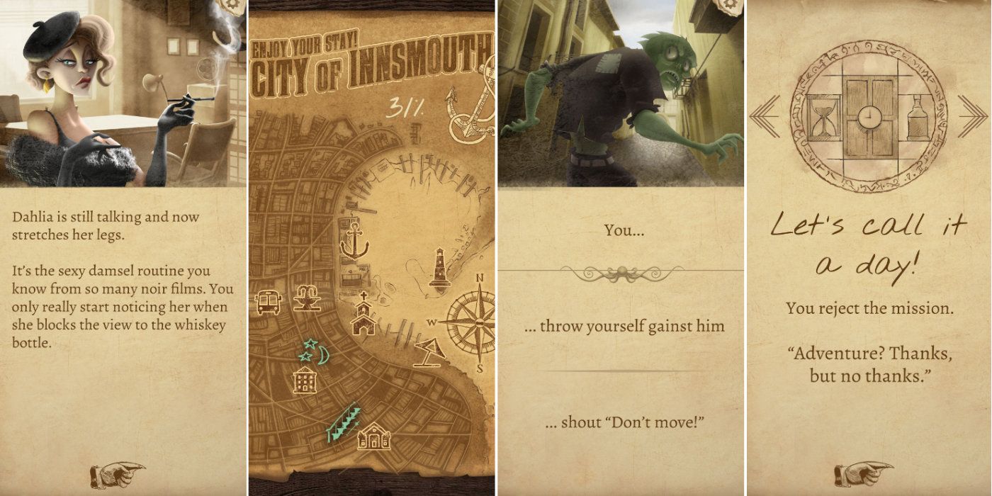 En El caso Innsmouth, los jugadores deben buscar a la chica desaparecida y tomar decisiones para permanecer con vida entre la gente del pueblo que quiere utilizar al detective como sacrificio a los dioses antiguos. Esta aventura de texto ofrece múltiples opciones en cada escena: elige sabiamente o el detective podría terminar siendo alimento para peces del infierno. La historia es intrigante, y cada escenario y personaje se suma al macabro tono lovecraftiano.