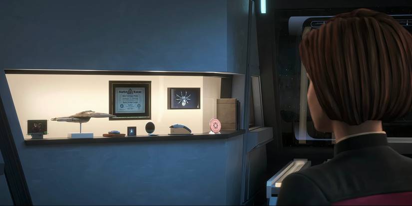 Además de la araña, la sala de preparación de Janeway tiene varias otras Viajero devoluciones de llamada que dejan claro lo importante que sigue siendo para ella su comando más famoso. Un modelo del USS Voyager original, junto con el caza de Janeway y el phaser del barco, constituyen las referencias más obvias.Además, hay una foto de Janeway y un setter irlandés que actúa como referencia a Molly, la perra de Janeway que abandonó cuando la Voyager quedó varada en el Cuadrante Delta. No está claro si la foto es en realidad de Molly o de un perro nuevo, pero la referencia está presente de todos modos.