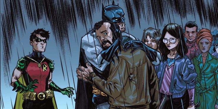 Al encontrarse con los posibles alborotadores y saqueadores frente a la iglesia, Tim se da cuenta de que Batman no debería revertir “Volver a ser quien siempre eres” tan rápido dado todo lo que ha hecho por Gotham City últimamente. En cambio, debería tomar la victoria y darse cuenta de que ha hecho lo suficiente para ganarse algo de felicidad para sí mismo. El Caballero de la Noche ignora a un Tim cada vez más preocupado mientras se enfrenta a los saqueadores, y hace algo inesperado para poner fin a esta pelea incluso antes de que comience: le da un abrazo a uno de los saqueadores.