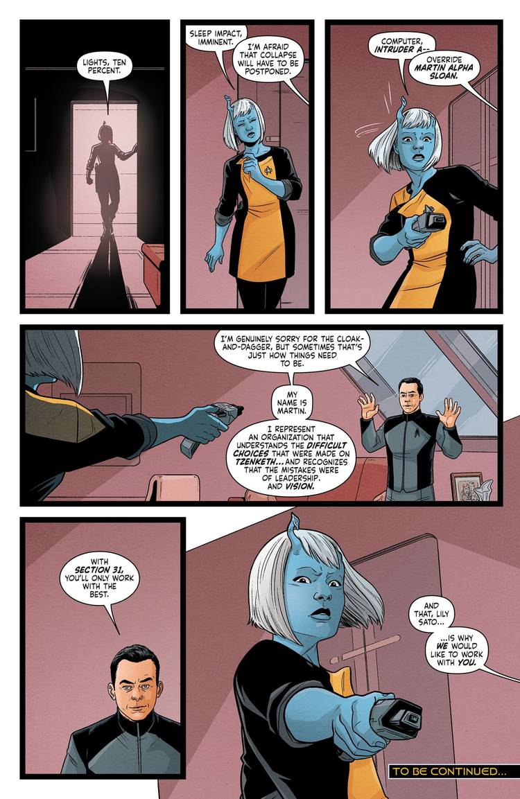 Star Trek El número 19 está escrito por Jackson Lanzing y Collin Kelly y dibujado por Megan Levens. A lo largo de Star Trek En la historia anterior, el alférez Sato se desilusionó cada vez más con la Flota Estelar y la Federación. Al final del número 19, un hombre se identifica con ella en su habitación y se identifica como “Martin” y utiliza la anulación de una persona llamada Sloan. Martin apela a la creciente insatisfacción de Sato y le dice que “se han cometido errores” y que ciertos funcionarios de la Flota Estelar “carecen de liderazgo”.