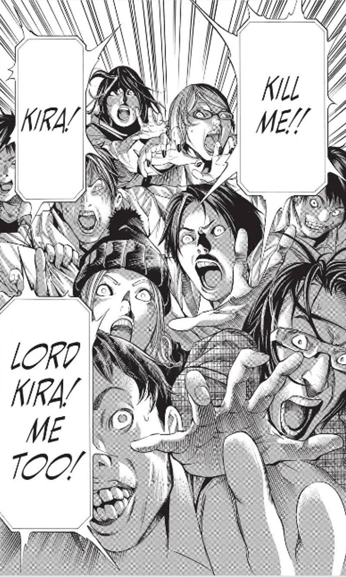 Capítulo 1 de la Aviso de muerte continuación, Cuentos cortos de Death Note emula este momento en un grado inquietante. La escena comienza con un grupo de ciudadanos comunes que debaten en la televisión en vivo sobre lo que asumen erróneamente que es el resurgimiento de Kira. En verdad, el perpetrador es uno de los dos Kiras que han recibido un Death Note del shinigami Ryuk. Este poseedor de Death Note al que el detective N se refiere como Kira-C, mientras que el otro del capítulo 2 de Cuentos cortos de Death Note se designa como Kira-A. Los ciudadanos que aparecen en la televisión para hablar de Kira-C están escondidos detrás de una barrera para protegerlos, pero mientras debaten, pronto se dan cuenta de que todos quieren morir, y una vez que llegan a esta escalofriante revelación, se envalentonan, derribando la barrera mientras corren hacia la cámara de televisión, suplicando a Kira-C que los mate. De una manera apropiada para el sucesor de Light, Kira-C obedece, lo que hace que cada persona se derrumbe en el suelo de manera dramática.