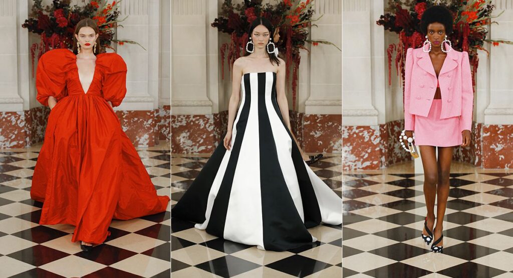 El sentimiento de celebración también podía percibirse en la mayoría de las propuestas. En Carolina Herrera era literal, porque la firma cumple cuarenta años. Wes Gordon, su director creativo, se regodea en los archivos de la marca en una colección que comienza con los juegos gráficos en blanco y negro, seña de identidad de la casa, y da paso a imponentes prendas rosas, rojas y de estampado floreado. Las mangas abullonadas, otro de los elementos recurrentes en Herrera, despliegan más su volumen y los vestidos, cortos o largos, juegan con la majestuosidad de tules y sedas y con los bordados a mano. “Para esta propuesta he tomado como punto de partida la colección primavera-verano 1983, una de mis favoritas. La mujer de Carolina Herrera siempre ha sido muy consciente del poder transformador de la moda”, afirma Gordon, que también destaca la importancia capital de su equipo y su taller, “trabajando sin descanso durante meses”.