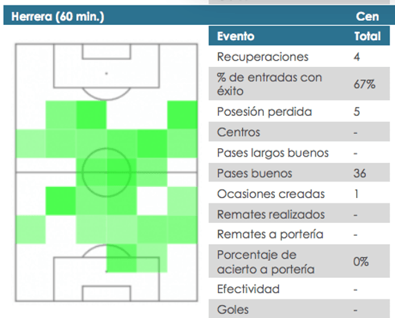 En los 65 minutos que estuvo sobre el terreno de juego, Herrera dio 36 pases buenos y sólo falló cuatro, lo que representa un 90% de acierto en los pases. Además, generó una ocasión de gol para los compañeros, realizó dos de tres entradas con éxito, recuperó cuatro balones y perdió cinco veces la posesión.