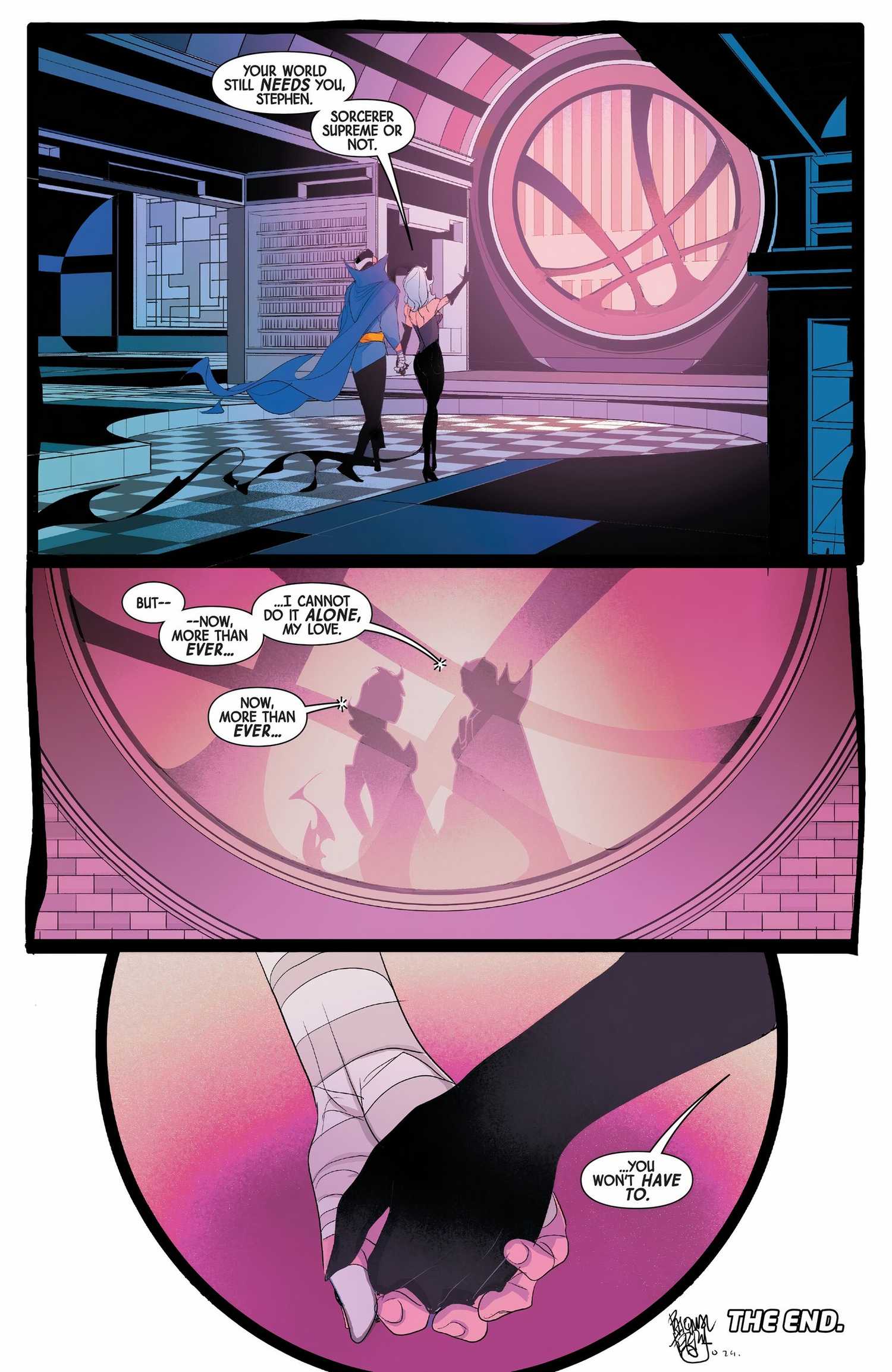 El tema también vincula líneas argumentales que se han desarrollado a lo largo del libro, como Wong y su nuevo equipo WAND, así como el matrimonio de Strange con Clea.