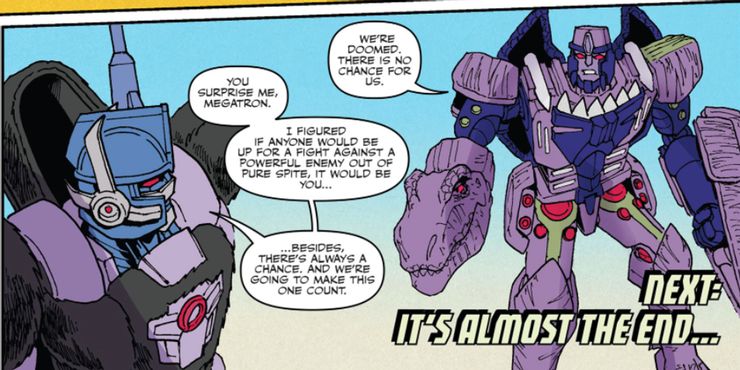 En el número, Optimus Primal y Megatron finalmente se encuentran cara a cara con la misteriosa raza alienígena divina de Transformers conocida como Vok que ha estado usando el planeta en el que se estrelló Transformers como parte de un experimento en curso. Los Vok solo pretendían que esta reunión fuera una breve introducción antes de destruirlos pero cuando los Vok están a punto de acabar con la vida de Megatron, se sorprenden cuando Optimus Primal lo protege, a lo que recompensan dándole a los Transformers siete ciclos para defenderse de su inminente ataque. condenar. Esto no es un buen augurio para Optimus Primal porque este último arco con Vok se basa libremente en la primera temporada del programa de televisión y Optimus no estaba en un buen lugar al final. Dado que existe la posibilidad de que el cómic concluya más temprano que tarde, los escritores podrían terminar su serie de la misma manera, excepto que sería permanente.