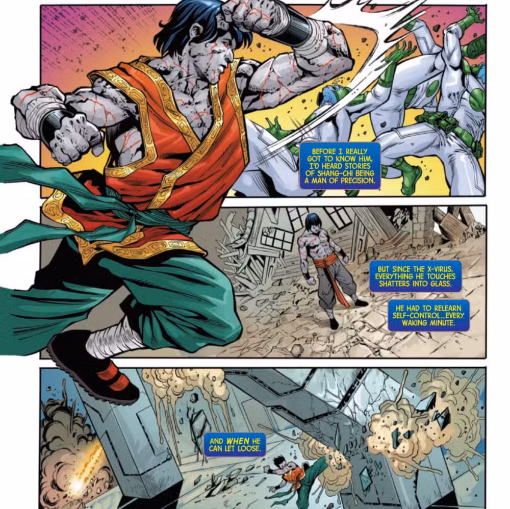 Con sus nuevos poderes, Shang-Chi destroza todo lo que toca, desde huesos hasta hormigón. Shang-Chi, que ya es el artista marcial más grande del mundo, ahora es capaz de derribar un rascacielos.