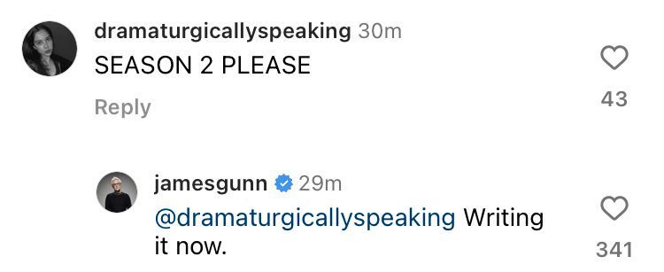 En Instagram, un fan le preguntó a Gunn sobre el estado de Pacificador temporada 2.