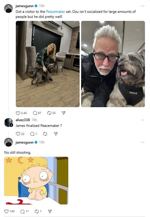 Pacificador La temporada 2, que se ha estado filmando desde abril, aparentemente aún no ha terminado por completo con la producción, ya que Se le preguntó a Gunn sobre el estado más reciente del programa Max en Threads.. Si bien no reveló ningún detalle nuevo de la trama, Gunn confirmó que Pacificador En realidad, la temporada 2 todavía se está filmando. Mira su respuesta a continuación: