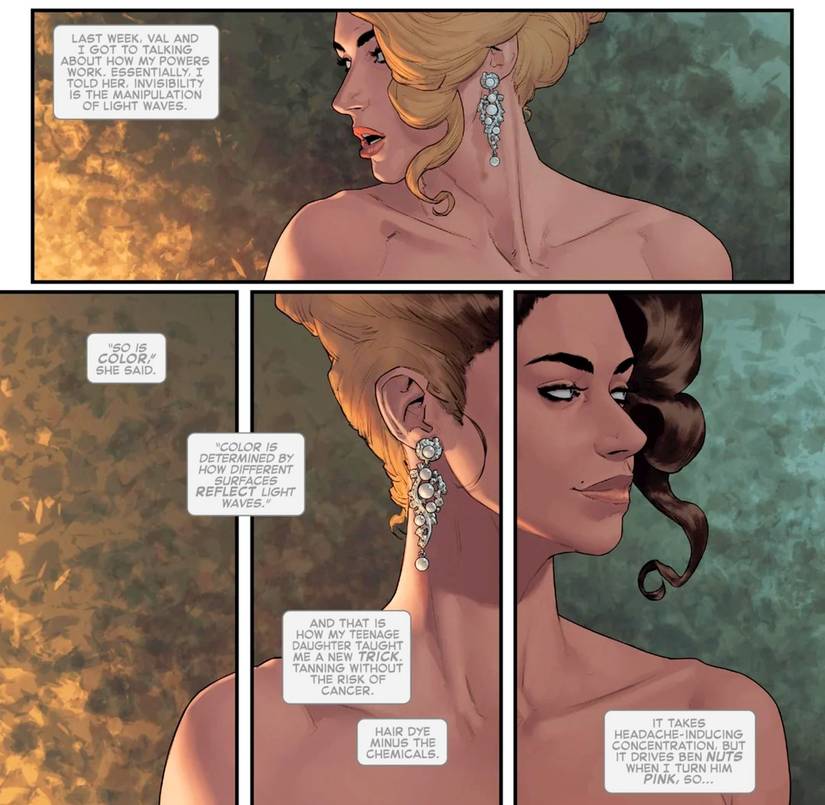 Sorprendentemente para una película que no es exactamente amada, 2005 Cuatro fantásticos clavó este aspecto del equipo. Reed, Sue, Johnny y Ben se muestran usando sus poderes de manera cotidiana: Reed impresiona a algunos asistentes al club con movimientos de baile imposibles, la antorcha humana se seca al instante después de una ducha, y la mujer invisible aclara su piel al hacer un ZIT invisible. En los cómics, el equipo impulsa aún más sus habilidades, y Sue Storm puede cambiar el color de su cabello y piel gracias a su control sobre el espectro visual.
