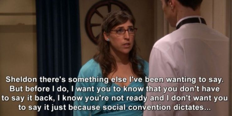 Amy: “Quiero que sepas que no tienes que decirlo. Sé que no estás listo y no quiero que lo digas solo porque lo dicta la convención social —” Sheldon: “Te amo” También.”