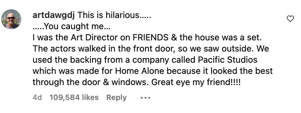 En los comentarios, Amigos El director de arte Daren Janes, que trabajó en 209 episodios del programa, intervino para confirmar que “Usamos el respaldo de una compañía llamada Pacific Studios que fue hecha para Home Alone porque se veía mejor a través de las puertas y ventanas..” Lea el comentario completo de Janes a continuación: