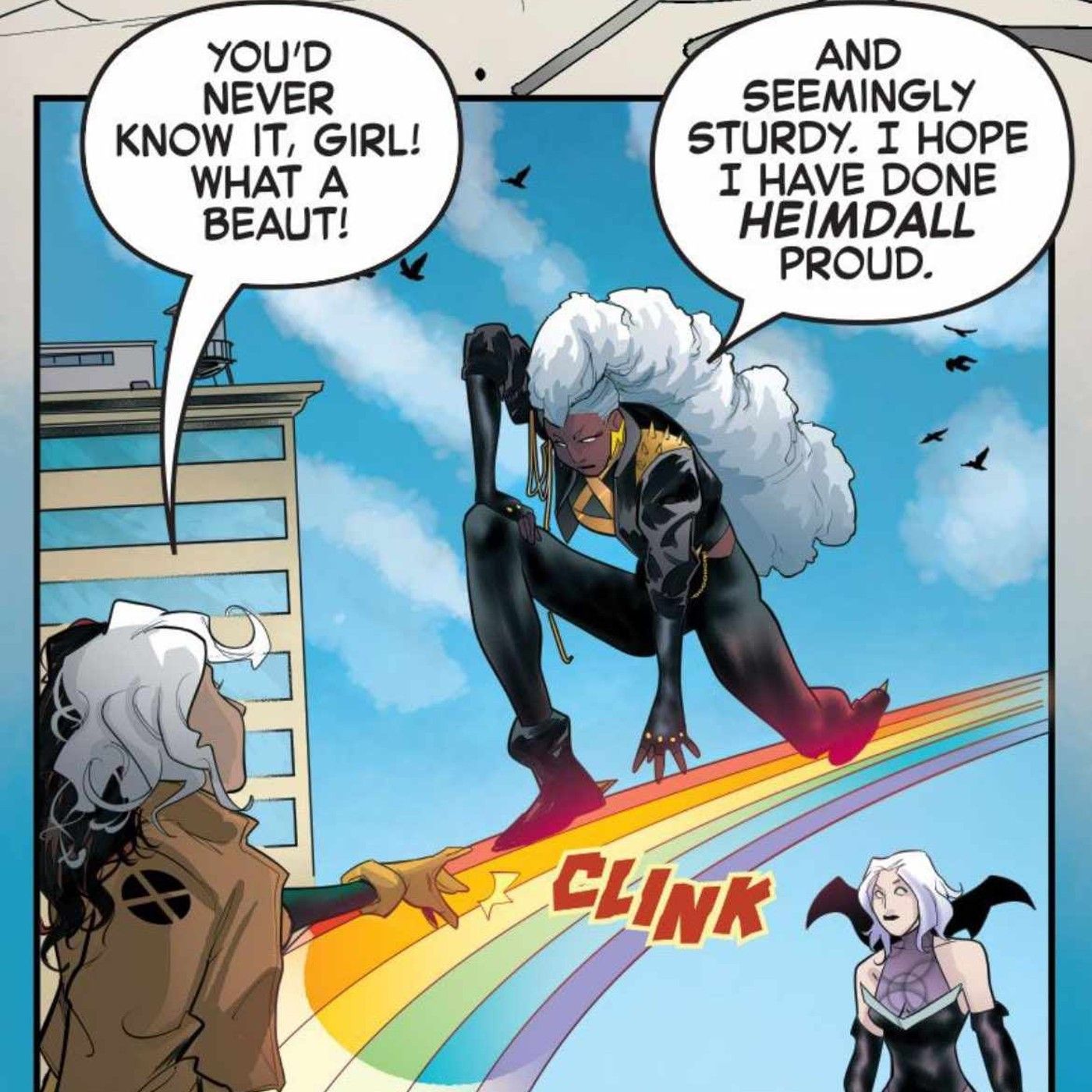 Storm demuestra que es capaz de manifestar un puente Bifrost solo con pura fuerza de voluntad. Cómic Marvel Voices Infinity #92. Como Rogue, Clea Strange y Nico Minoru necesitan el Fragmento de Vida para devolver el espíritu de Black Widow a su cuerpo, necesitan que Storm entre a Asgard en su nombre. Sorprendentemente, Storm puede crear un puente arcoíris para poder realizar el viaje.