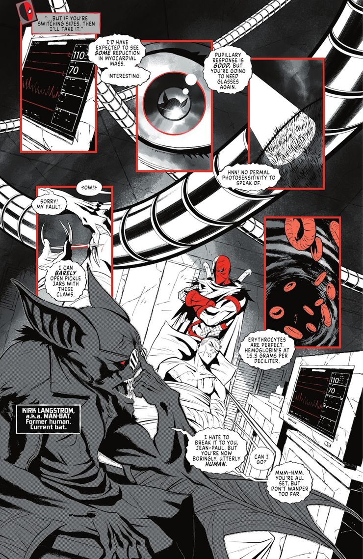 DC vs. Vampiros: Guerra Total #1 está escrito por Alex Paknadel y Matthew Rosenberg con arte de Pasquale Qualano. El número, el primero de una serie de seis partes relacionadas con el tema principal DC contra vampiros evento, utiliza exclusivamente el negro, el blanco y el rojo en su sanguinario arte. Si bien la pérdida del último Lazarus Pit puede ser una derrota para Deathstroke y su resistencia, la misión termina con una poderosa actualización de la tradición de Batman: Azrael emerge como humano una vez más, demostrando que los pozos pueden revertir el vampirismo.