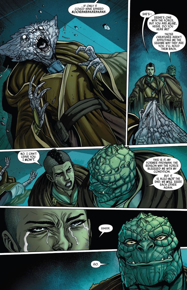 Si bien la forma de la muerte es horrible, la forma en que se presentó al lector en este número es accidentalmente tonta. Después de que Keeve lucha con éxito contra la presencia oscura, otro Jedi no tiene tanta suerte, un Frozian llamado Nooranbakarakana, también conocido como Nooran. La razón por la que la muerte de Nooran es tan divertida es la naturaleza abrupta y exagerada de la escena. En una página del cómic, los otros Jedi hablan sobre la seriedad de la amenaza que enfrentan y la suerte que tiene Keeve de estar vivo, luego el lector pasa a la siguiente página donde de repente son golpeados en la cara con un gato caricaturesco. como un extraterrestre que posa en un rictus de muerte exagerado similar al de la estatua viviente en la película pelusa caliente.