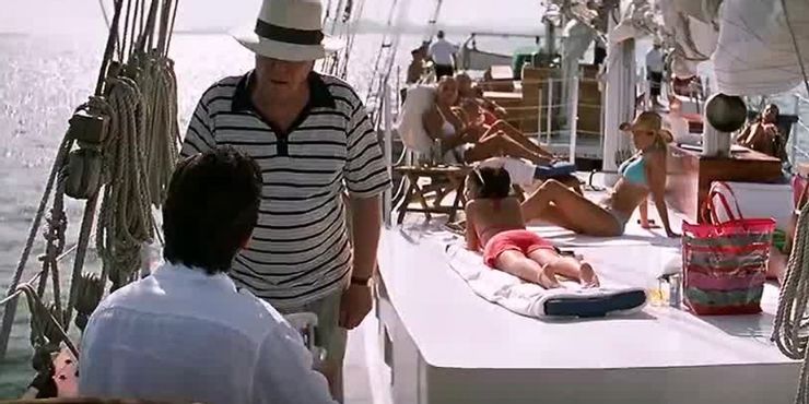 La forma cómica dorada de Alfred aparece una vez más en la escena. El mayordomo no considera aplicar loción corporal a mujeres al azar como parte de la descripción de su trabajo, por lo que se enfada. A través de la escena del barco, también se destaca el lado playboy de Bruce Wayne, tanto que aparece en los titulares de las noticias.