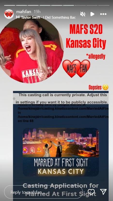 Hubo un MAFS foto con un logo que decía: “Casado a primera vista: Kansas City“. La cuenta de fan incluía leyendas como “pretendidamente” y “oopsies” con un emoji de cara sonriente al revés. Incluyeron la canción “I Did Something Bad”, de Taylor Swift, cuyo novio es el ala cerrada de los Kansas City Chiefs, Travis Kelce, y una foto de Taylor reaccionando en uno de los partidos de fútbol.