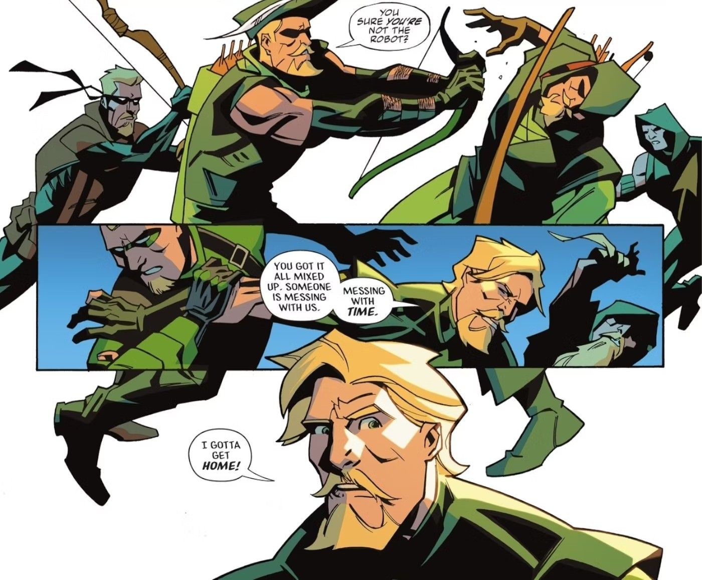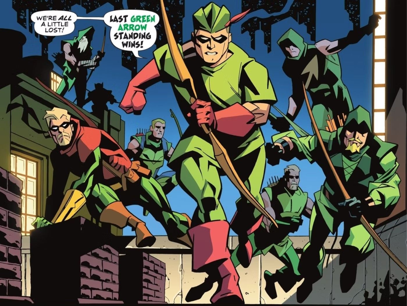 - Aparecen versiones desplazadas de Green Arrow de diferentes períodos de tiempo, lo que lleva a una pelea épica sin cuartel.