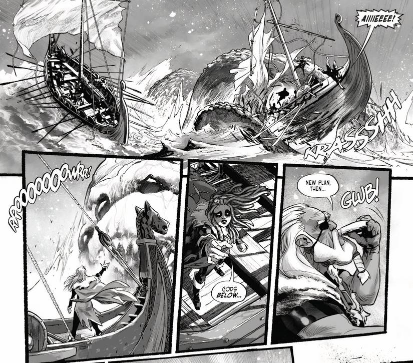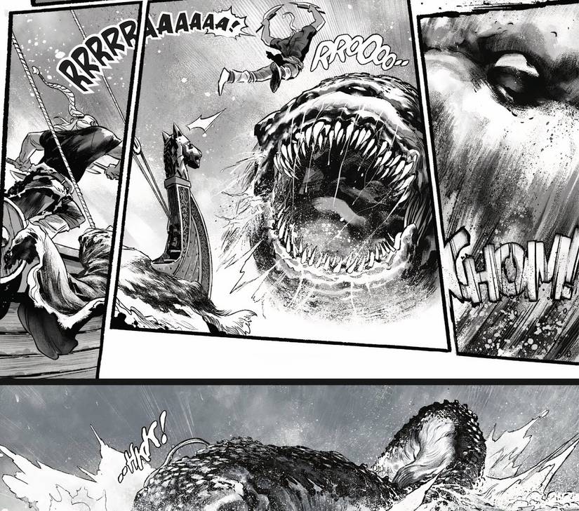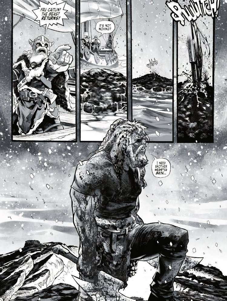 El panel muestra a Slade en todo su esplendor vikingo, agarrando dos hachas de batalla mientras está de pie sobre el cadáver del Kraken, empapado en sangre y entrañas.