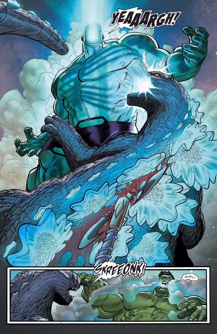 En teoría, Hulk tiene todo lo que necesita para ganar. Recibe un impulso del tamaño de un kaiju de las partículas Pym, empuña armas de vibranio hechas a medida y diseñadas por los habitantes de Wakanda y conserva su fuente inagotable de poder y energía gamma. Pero mientras logra sacarle sangre a Godzilla, Hulk rápidamente se encuentra luchando. Tan pronto como lo muerden, Hulk baja la guardia y le da a Godzilla la oportunidad de freírlo del revés con su aliento atómico.