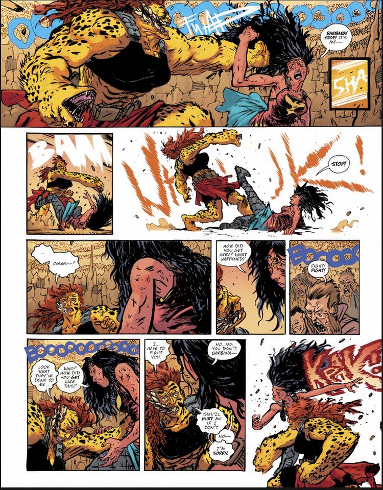 Es importante recordar que han pasado cientos de años desde que Diana y Barbara se vieron por última vez. Durante ese tiempo, Barbara ha sufrido mutaciones debido a la radiación nuclear, ha sido capturada, torturada y obligada a luchar por humanos. Cuando Cheetah se libera por primera vez, ataca a Wonder Woman sin darse cuenta de a quién está atacando. Diana, que no quiere hacerle daño a su ex amiga, lucha a la defensiva, intentando llegar a Barbara y hacerle reconocer quién es. Finalmente, Cheetah reconoce a Wonder Woman y queda claro que, a pesar de su historia antagónica, no quiere luchar contra la amazona.