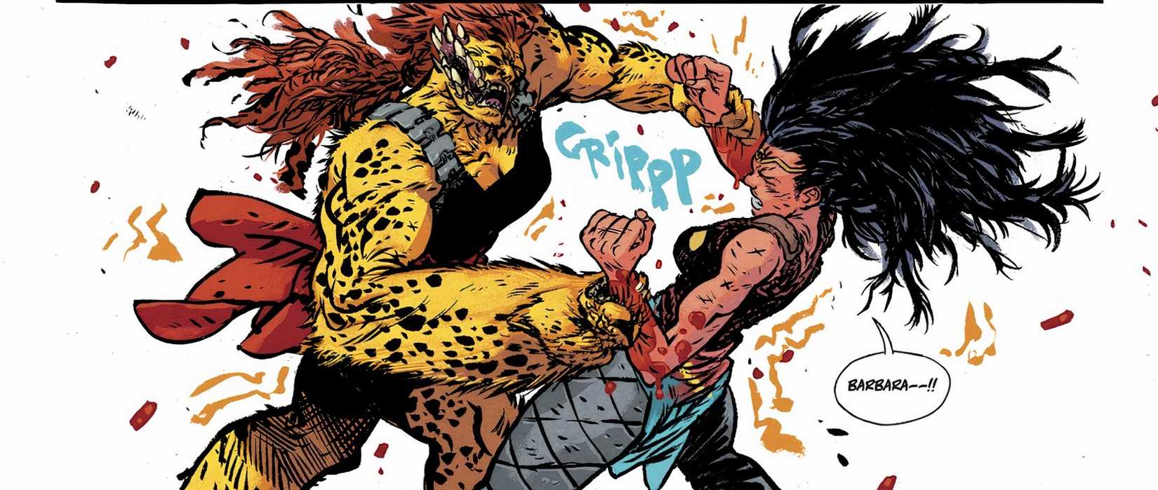 La batalla entre Wonder Woman y Cheetah se ve interrumpida abruptamente por una horda de mutantes que atacan, lo que obliga a Diana a centrarse en salvar a los humanos mientras Barbara aprovecha la oportunidad para atacar a su captor. Diana logra defenderse de los mutantes y evitar que Cheetah ataque a su captor, lo que genera un momento profundamente emotivo entre las dos mujeres. Mientras Diana contiene a una Barbara furiosa y traumatizada, Cheetah le suplica, gritando: “¡No sabes lo que me hizo!” A pesar de la angustia de Barbara, Wonder Woman responde con simpatía pero se mantiene firme en mostrarle a sus captores. “gracia,” Lo que lleva a Barbara a romper a llorar en los brazos de Diana.