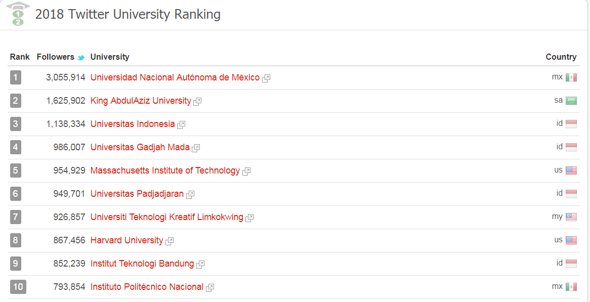 Al presentarse The uniRank Twitter University Ranking 2018, en el sitio https://www.4icu.org/top-universities-twitter se exponen las 200 mejores instituciones de educación superior en dicha red social.