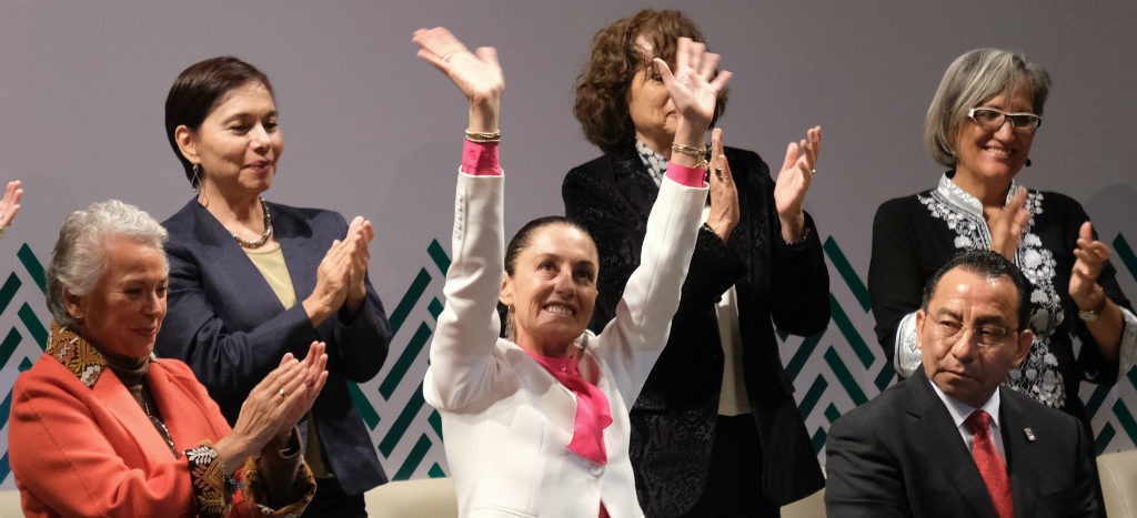 En el Teatro de la Ciudad, a Sheinbaum la arropaban cuatro secretarios de Estado del gobierno de Andrés Manuel López Obrador: Olga Sánchez Cordero, de Gobernación; Irma Eréndira Sandoval, de la Función Pública; Javier Jiménez Espriú, de Comunicaciones y Transportes, y el canciller Marcelo Ebrard, a quien le reconoció haber dejado una ciudad segura y con una de las mejores policías de todo el país cuando fue jefe de Gobierno, de 2006 a 2012.