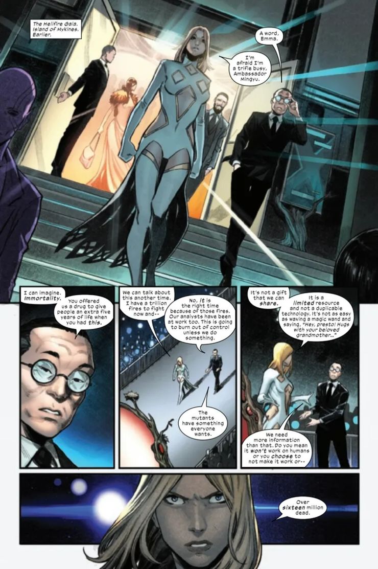 una vista previa para X-Men inmortales #4 – brillantemente escrito por Kieron Gillen con arte de Michele Bandini – muestra a Emma Frost intentando resolver una tonelada de crisis, con la solicitud del problema que dice que “…hará cualquier cosa para proteger a los niños, incluido el niño metafórico que es Hellfire Gala.Cuando Emma da un paso fuera de la animada Hellfire Gala, se le acerca Ma Mingyu, el jefe del Departamento de Ciencias del Estado chino, quien una vez se hizo pasar por embajador para obtener acceso al Hábitat de Jerusalén de Krakoa cuando se fundó la nación por primera vez. Mingyu llama a Emma, y Krakoa, por “solo” ofrecer a la humanidad una droga que prolongaría su vida unos cinco años más o menos, mientras que los mutantes pueden permanecer efectivamente inmortales, y Emma lo logra. muy claro que la inmortalidad, “… no es un regalo que podamos compartir”. Mingyu, siempre el político, chantajea efectivamente a Frost diciendo que él y los gobiernos del mundo ayudarán a la humanidad a aceptar la inmortalidad mutante si los mutantes están dispuestos a usar los Protocolos de Resurrección en líderes humanos, donantes clave y figuras de la industria.