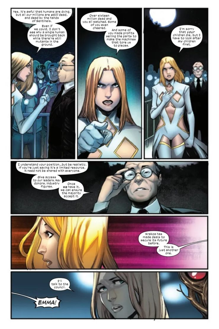 Cuando Mingyu lo presionó sobre si los mutantes Protocolos de Resurrección no poder resucitar humanos o si los mutantes no Emma explota sobre él y le recuerda a los 16 millones de mutantes asesinados de Genosha que todavía están tratando de resucitar, antes de que ella le diga con resignación: “Hablaré con el consejo”. Krakoa pudo convertirse tan rápidamente en una nación soberana mundial (y galáctica) reconocida porque pudieron usar de manera efectiva la idea humana del capitalismo para ofrecer a las naciones del mundo bienes como medicinas a cambio de reconocimiento, al mismo tiempo que estabilizaban la economía intergaláctica al encontrar y reproducir el metal Misterio. La isla de Krakoa no participa en el capitalismo en sí misma, aparentemente sin dinero ni bienes intercambiados en la isla, pero al igual que con las tres leyes de Krakoa, gran parte de su presentación al mundo es falsa, y su nueva sociedad es igual de defectuosa y rota como el resto del mundo. Ahora, sin embargo, la idea tradicional del capitalismo que los krakoanos siempre han usado externamente para mantener el poder de sus antiguos opresores humanos, puede volverse hacia adentro y ser solo otra razón por la que la “utopía” que es Krakoa comienza a desmoronarse bajo el peso de su propia fachada.