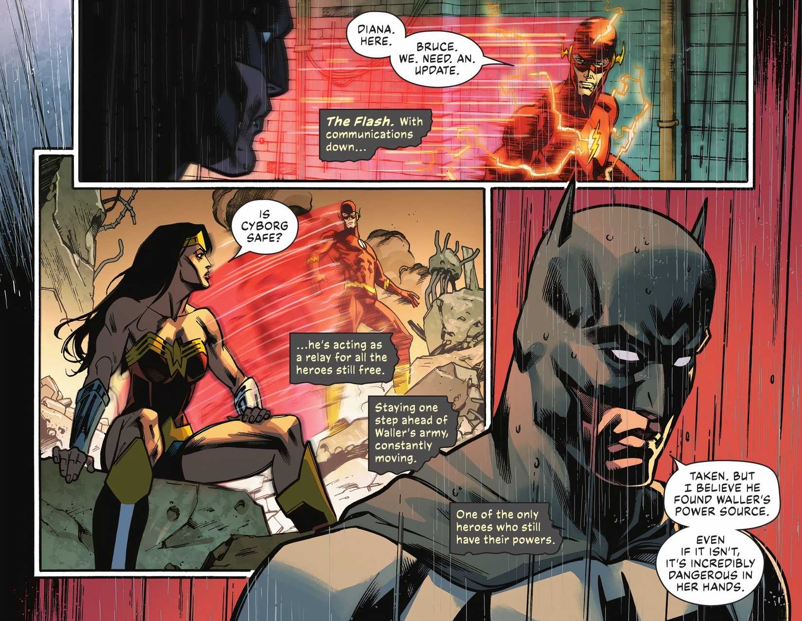 Desafortunadamente, el Amazo conocido como Paradise Lost secuestra a Cyborg. Después de no poder salvar a Victor, Batman se encuentra con Flash, quien le transmite un mensaje de Wonder Woman. Batman revela Flash es uno de los pocos héroes que todavía tiene sus poderes y los usa para actuar como una línea de comunicación segura..