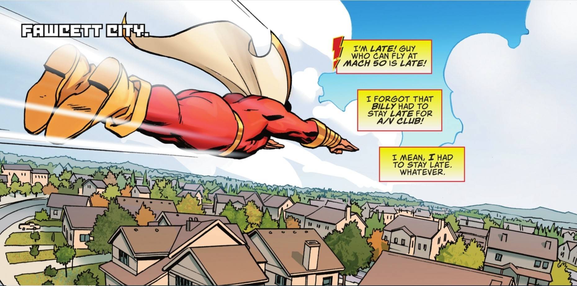 Después de someter a Fausto y a la criatura, Shazam se apresura a llegar a su reunión familiar. Es durante su apresurada huida que El monólogo interno de Billy revela la velocidad máxima de vuelo del héroe cuando se queja: “¡Voy tarde! ¡El tipo que puede volar a Mach 50 llega tarde!“