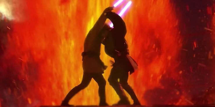 Si bien los duelos con sables de luz de la trilogía de la precuela con el Conde Dooku y Palpatine fueron decepcionados por la limitada fisicalidad de los actores que los interpretan, el duelo entre el joven y viril Anakin y Obi-Wan es una clase magistral en el juego de espadas futurista asistido por magia. Ewan McGregor, Hayden Christensen y su dedicado equipo de especialistas estaban completamente comprometidos con lograr que la intensidad de este duelo fuera acertada.
