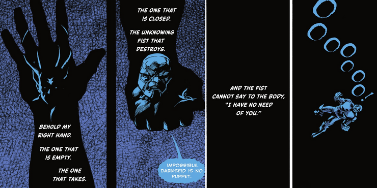 El problema no hace que Darkseid y la mano vacía sean hermanos biológicos, ya que está claro que los orígenes de la era Kirby de Darkseid todavía están intactos, pero tienen un vínculo metafísico recientemente revelado que los une como pareja. Como los superhéroes se han convertido en los anticuerpos naturales del universo, Darkseid y la Mano Vacía ahora parecen ser los agentes virales naturales de la Gran Oscuridad. El problema termina con Darkseid despojado de su voluntad y de vuelta en el “cuerpo” de la Gran Oscuridad junto con la Mano Vacía, Nekron, Neron, Ares, Doomsday, Eclipso, el Hombre al Revés y Pariah. El nuevo equipo de Darkseid finalmente encuentra las dos manos de la Gran Oscuridad reunidas y trabajando juntas.