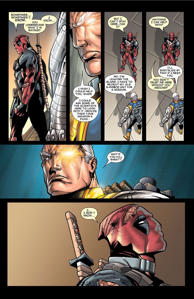 La lucrativa carrera de Wade Wilson como mercenario significa que no es ajeno a la muerte, pero nunca antes había tratado una vida humana como desechable como lo hace en Cable y Deadpool #13, escrito por Fabian Nicieza con arte de Patrick Zircher. En el número, Wade Wilson vive en Providence, una sociedad utópica creada por Cable a bordo de su antigua nave espacial. En Providence, Deadpool tiene la tarea de investigar el asesinato de Haji Bin Barat, un terrorista con quien Cable intentaba razonar. Sin embargo, al final del número, se revela que Wade es quien mató a Haji Bin Barat. El factor de curación de Deadpool aparentemente interfirió con su cerebro, cambiando su memoria del incidente y haciéndolo olvidar el asesinato que cometió.