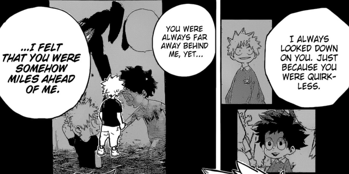 Durante algún tiempo, los fanáticos habían creído comprensiblemente que, cuando eran niños, Bakugo intimidaba al joven Izuku Midoriya sin piedad, porque no tenía peculiaridades y, sin embargo, aún deseaba ser un héroe, lo cual era aparentemente imposible. En comparación, Bakugo no sólo poseía una peculiaridad, sino que era especialmente poderosa y llamativa. Los lectores de manga llegaron a la conclusión de que Bakugo simplemente disfrutaba intimidando a Deku porque era un blanco fácil. La ira y el resentimiento de Bakugo hacia Deku cuando de repente adquirió el increíble poder de All Might e incluso fue aceptado en UA High tenía mucho sentido. La confesión de Bakugo, sin embargo, demuestra que sus sentimientos eran mucho más complejos que eso.