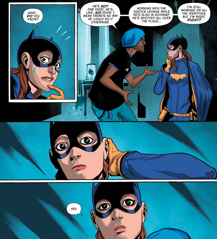 En Batgirl y las Aves de Presa #5, Batgirl y el equipo se encuentran con el pirata informático Gus, un individuo muy temerario que afirma tener información sobre Batman que nadie más conoce. Barbara Gordon está claramente nerviosa, pero debe seguirle el juego. “¡Él no es un tipo, es como seis tipos!” revela un Gus triunfante. El hacker no ve otra forma de que Batman pueda aparecer por todo Gotham tan rápido, sin mencionar sus hazañas con la Liga de la Justicia. “Todavía estoy trabajando en todas las identidades, pero tengo razón, ¿verdad?” Batgirl solo puede asentir con la cabeza y “confirmar” las sospechas de Gus. La identidad de Bruce está a salvo, gracias a un gothamita que piensa demasiado.